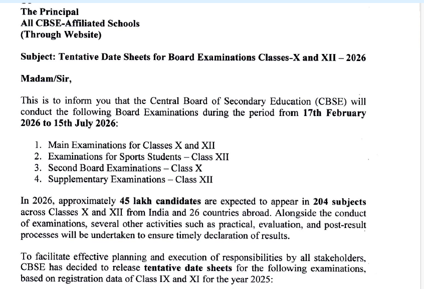 CBSE has released the final date sheet for the 2026 exams. This schedule is based on the List of Candidates (LOC) submitted by schools, ensuring accuracy in the number of students appearing for each subject. No major changes are expected unless there is an emergency notification from CBSE.