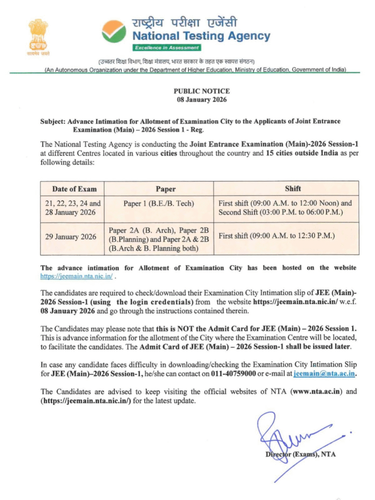 The National Testing Agency (NTA) is conducting JEE (Main) 2026 – Session 1 across multiple centres in India and 15 cities outside India. To help candidates plan their travel, NTA has now released the Examination City Intimation Slip.