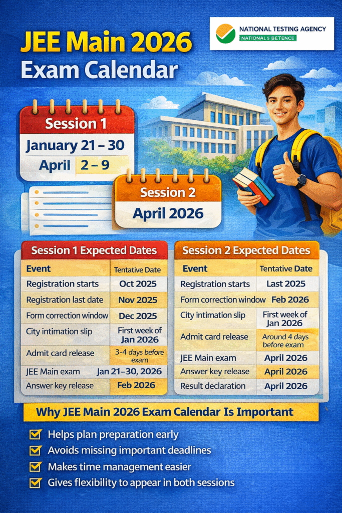 The JEE Main 2026 exam calendar is being released. Additionally, it takes into account previous year trends. This schedule provides an expected timeline of major events related to both sessions. However, the final and detailed calendar, which includes exact deadlines for each stage, will be released separately by the NTA.